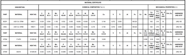 HUAMEI MACHINERY offers double offset high-performance butterfly valves covering ASTM A351 CF8M material. Standard mill certificate be offered for each order as below template.